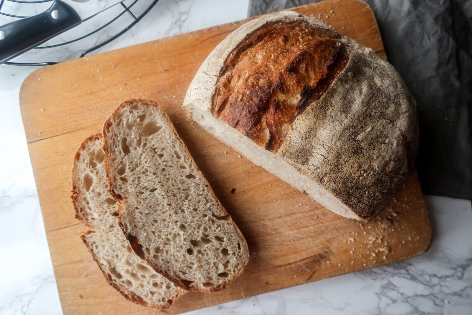 12. Po upečení chleba vyklopíme a dáme chladnout na mřížku minimálně na hodinu. Nezakrajujte do teplého chleba, jinak by se vám mohl vnitřek srazit.
