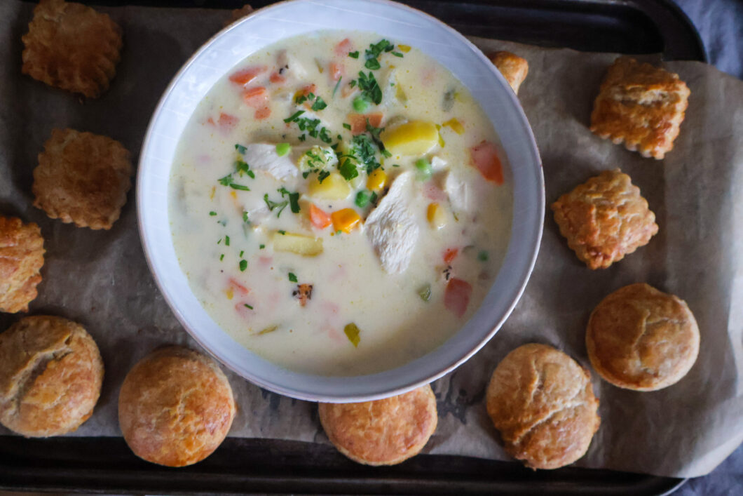 Tahle polévka je plná jemných chutí, bylinek a spousty zeleniny, takže pokud máte rádi robustnější typy polévek, tuhle si určitě nechcete nechat ujít! Vcelku zábavné a okouzlující spojení krémové kuřecí polévky s křehkými máslovými žemličkami je vytvořeno podle známého zapečeného masového koláče s pokličkou, jinak známého jako “Pot pie“.