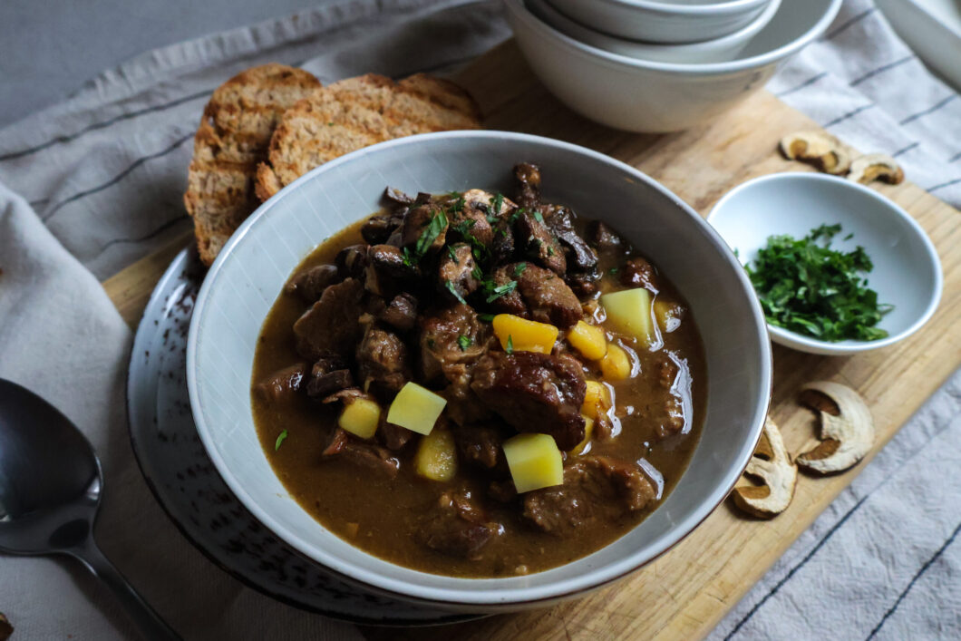 Jak uvařit hovězí guláš s opečenými žampiony a miso pastou?