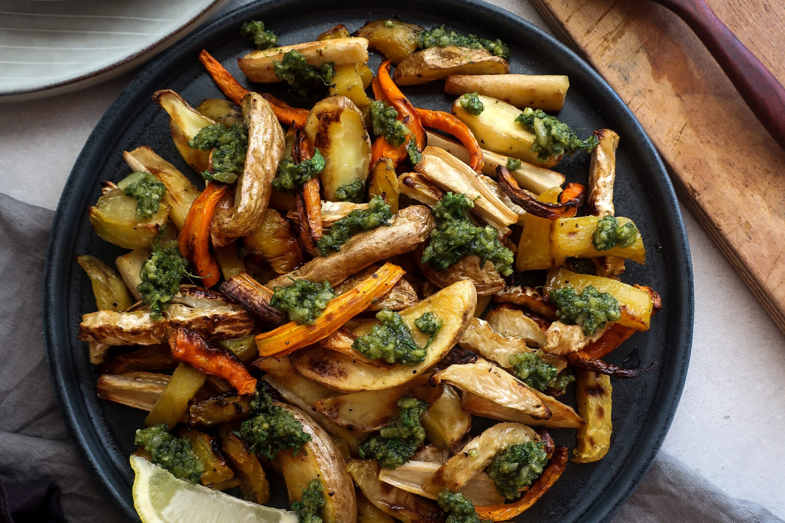 Jak připravit pečenou kořenovou zeleninu s koriandrovým pestem?