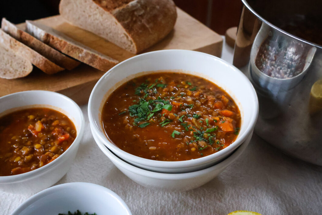 Čočkovou polévku podáváme s nakrájenou petrželkou a čerstvým kváskovým chlebem. Nejlepší je zrovna uvařená, takže žádné dlouhé prodlevy!